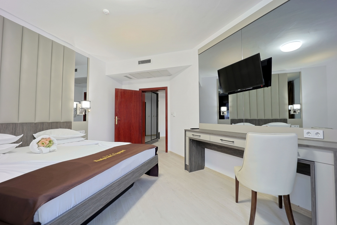 Apartment with two bedrooms: one with a double bed, a second bedroom with twin beds and a sofa bed, a private bathroom and a balcony with garden furniture. The apartment is equipped with central air conditioning, a safe, a mini fridge, internet, a TV with satellite channels, a shower and/or a bathtub in the bathroom, a hairdryer and toiletries.